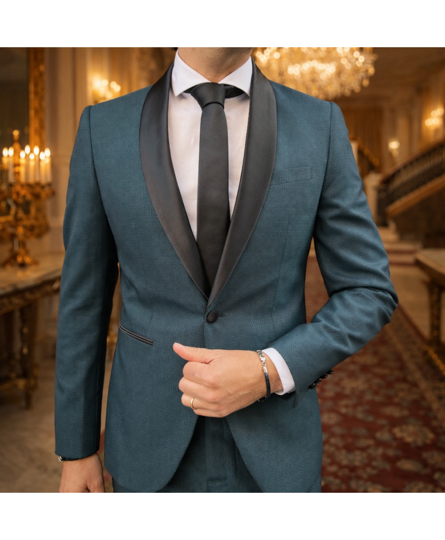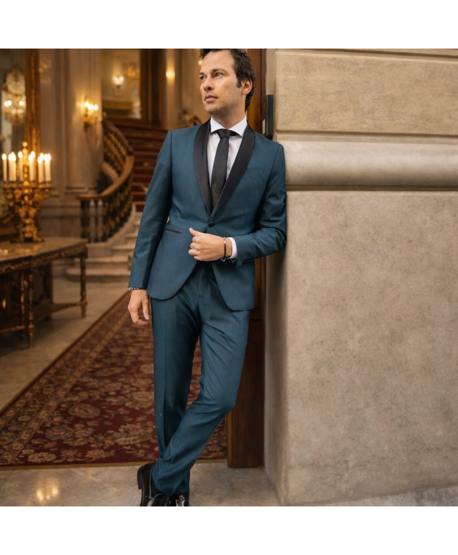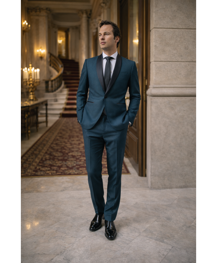 Elegante smoking blu con strass ideale per eventi formali e serate di gala.