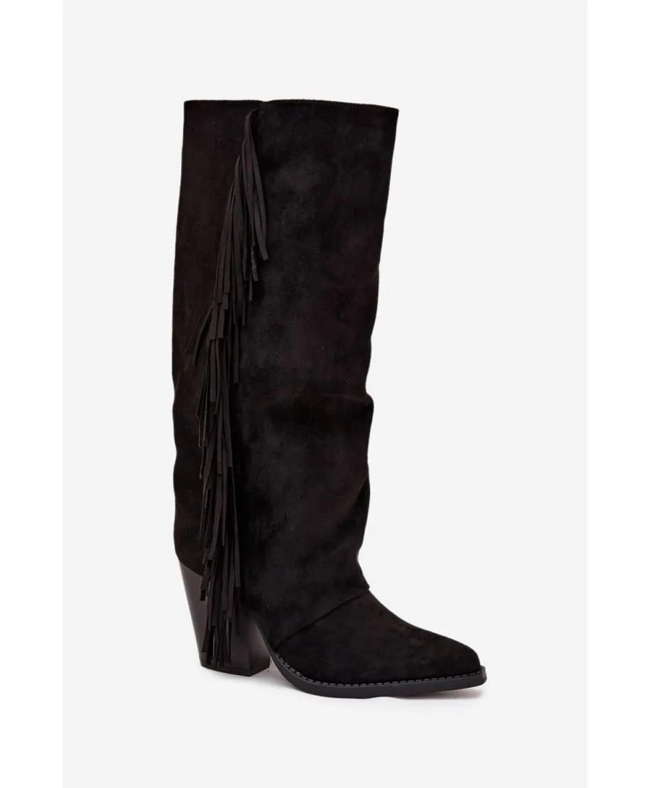 Stivali da cowgirl fino al ginocchio per donna, realizzati in ecopelle scamosciata, sono una proposta alla moda per molte combinazioni. Il tacco a forma di colonna garantisce comfort, mentre la chiusura con zip facilita l'indossamento. Punta a punta. Le frange sul lato della gambale introducono un po' di relax e carattere boho. Perfetti per outfit casual, si abbinano alla perfezione con abiti, gonne e pantaloni, creando un look moderno e cowgirl.
