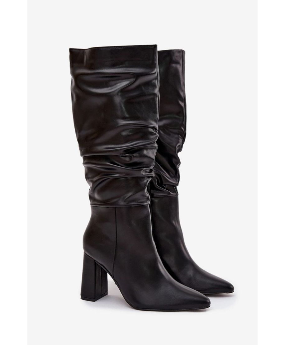 Stivali da donna realizzati in ecopelle. Il tacco stabile a colonna garantisce comfort durante la camminata, mentre le punte a mandorla aggiungono un tocco classico. Il gambale arricciato conferisce un aspetto alla moda e originale, che li rende perfetti per distinguersi nello stile. Gli stivali si chiudono con una pratica zip, che facilita la calzata e lo sfilarli. Perfetti sia con i pantaloni che con i vestiti, si adattano a numerosi outfit casual ed eleganti.
