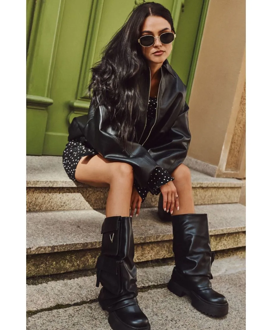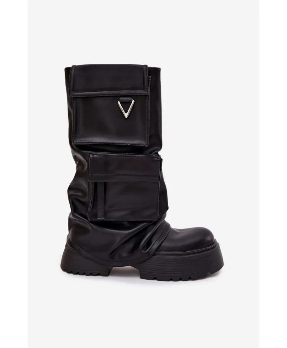 Stivali da donna realizzati in ecopelle di alta qualità sono la scelta ideale per le donne che apprezzano il design moderno e il comfort. Il modello slip-on facilita l'indossamento e si adatta perfettamente al piede, mentre la massiccia piattaforma garantisce stabilità e comfort durante l'uso, conferendo contemporaneamente ai stivali un carattere deciso. Il modello si distingue per il gambale decorativo e le tasche che conferiscono all'insieme un aspetto originale e non convenzionale. Lo stile elegante rende questi stivali perfettamente in linea con le tendenze attuali e saranno un forte punto focale nelle tue quotidiane e urbane mise. Si abbinano perfettamente sia con pantaloni aderenti, che con abiti corti o gonne.