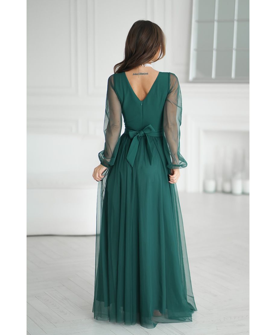 Vestito lungo elegante con gonna in tulle e corpetto con scollatura a V. Cerniera nella parte posteriore. Abito ha le maniche lunghe realizzate in tulle. Cinturino sottolinea il punto vita.