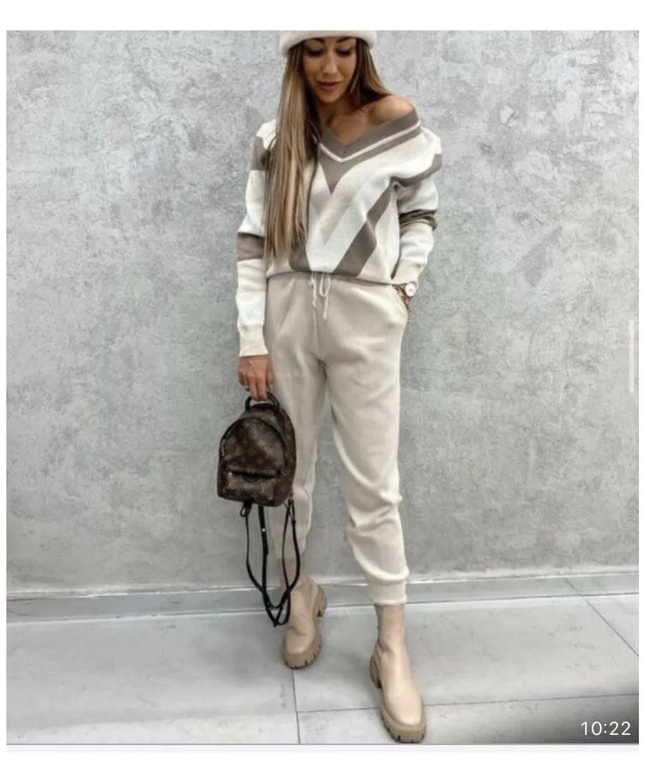 La tuta elegante da passeggio, in una modellistica così elegante non si trova mai, anche la più comoda delle tute non sarà paragonabile a questa con la maglia fantasia scollo a V. Pantalone con coulisse e finale con elastico alla caviglia.