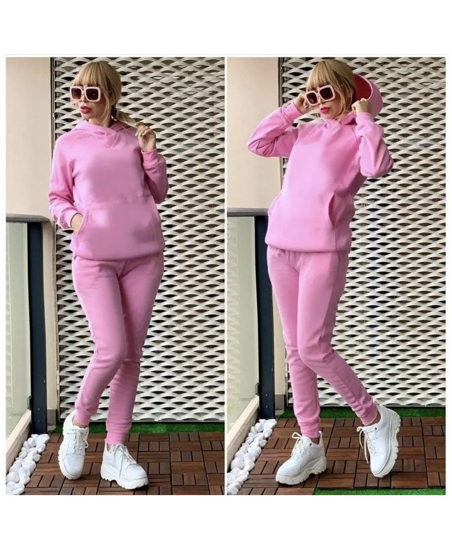 Tuta femminile, colori flu. Felpa con cappuccio e pantaloni slim. Finale con elastici.