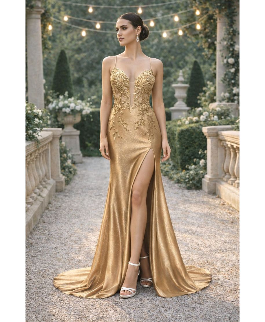 Abito lungo da cerimonia in raso lucido color azzurro cielo, valorizzato da preziosi ricami floreali tono su tono. Il corpetto strutturato con scollo a cuore e inserti trasparenti dona un tocco sofisticato e femminile. La linea aderente slancia la figura, mentre lo spacco laterale aggiunge sensualità al look. Perfetto per matrimoni, serate eleganti e occasioni importanti.