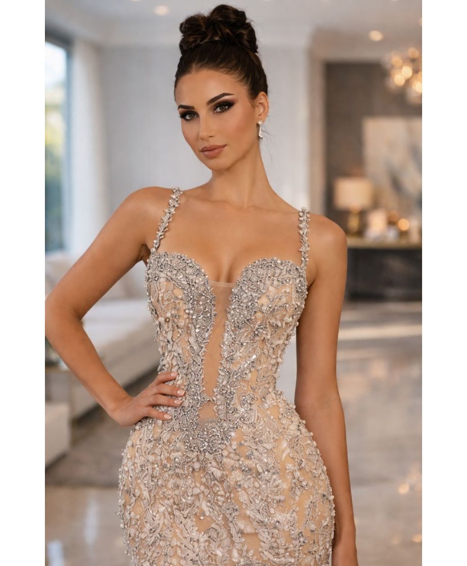 Abito da cerimonia a sirena con corpetto decorato con strass e perline