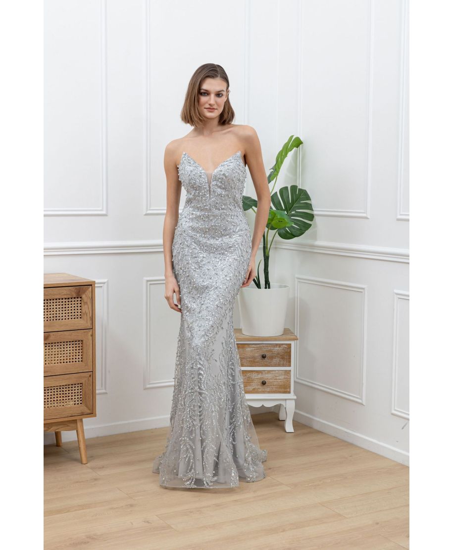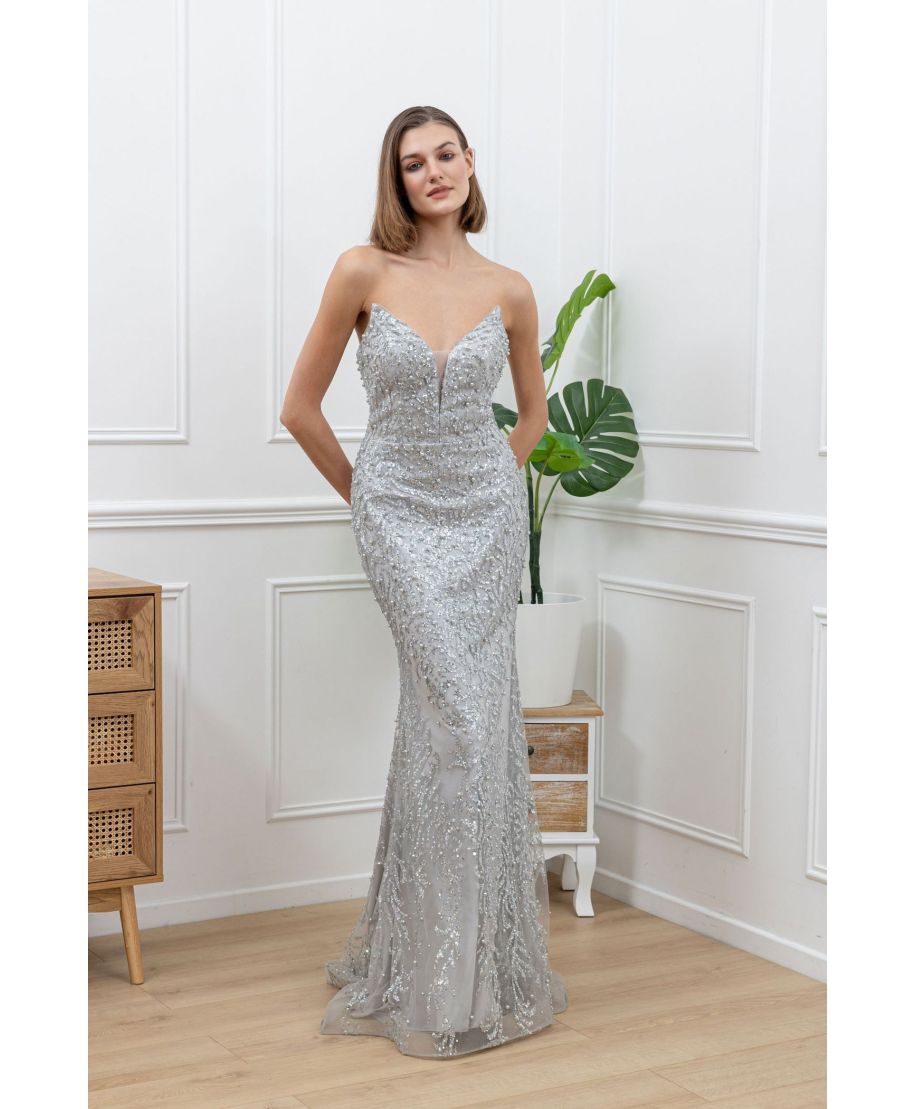 Realizzato con materiali di alta qualità, offrendo una sensazione di lusso e comfort. L'abito presenta un taglio lungo a sirena che si adatta dolcemente alle curve del corpo, esaltando la figura con grazia. Il corsetto presenta scollatura a cuore. Colore argento cattura la luce ed esalta il tuo look con un tocco scintillante.