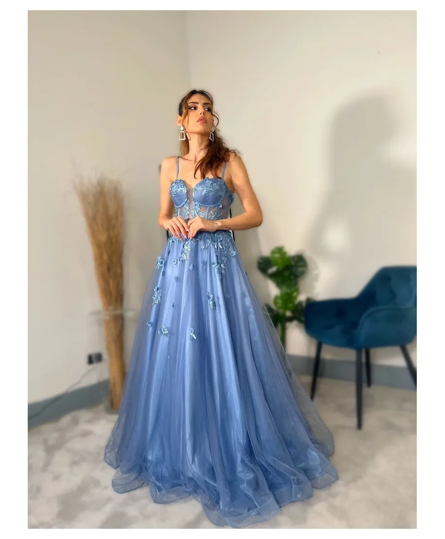 Abito da sera blu notte con tessuto scintillante e silhouette slanciata