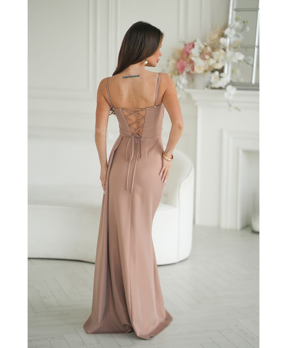 • Abito lungo elegante in colore camel con effetto leggermente luminoso