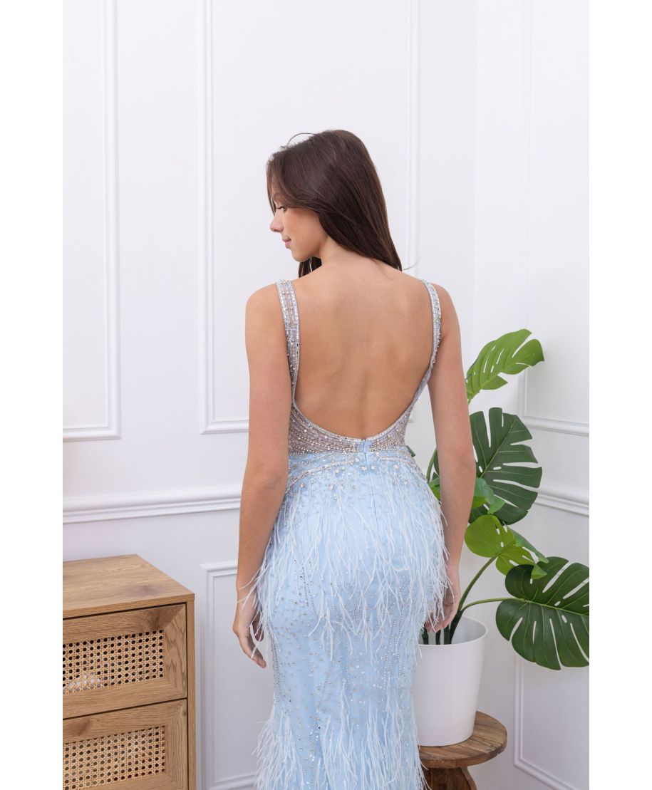 Le piume strategicamente applicate conferiscono al vestito un aspetto etereo e leggero, creando un effetto drammatico e senza tempo che cattura l'attenzione di tutti. L'azzurro delicato trasmette una sensazione di tranquillità e purezza, ideale per una cerimonia estiva all'aperto, mentre la variante oro aggiunge un tocco di lusso e brillantezza, perfetto per eventi serali o ambienti più formali. La qualità dei materiali utilizzati assicura comfort e vestibilità eccellente, permettendo libertà di movimento, per goderti l'intera serata senza compromessi.