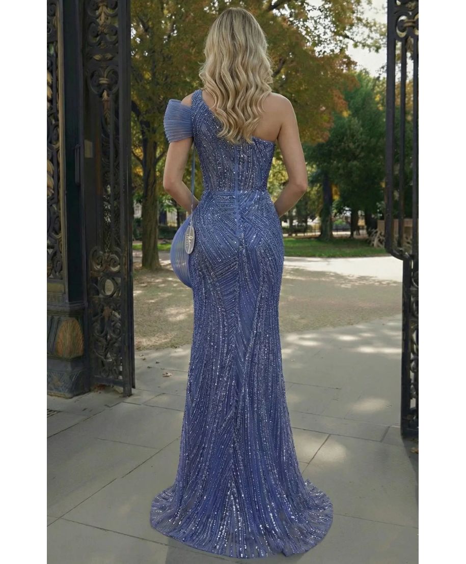 Vestito da cerimonia monospalla azzurro scuro interamente decorato con perline