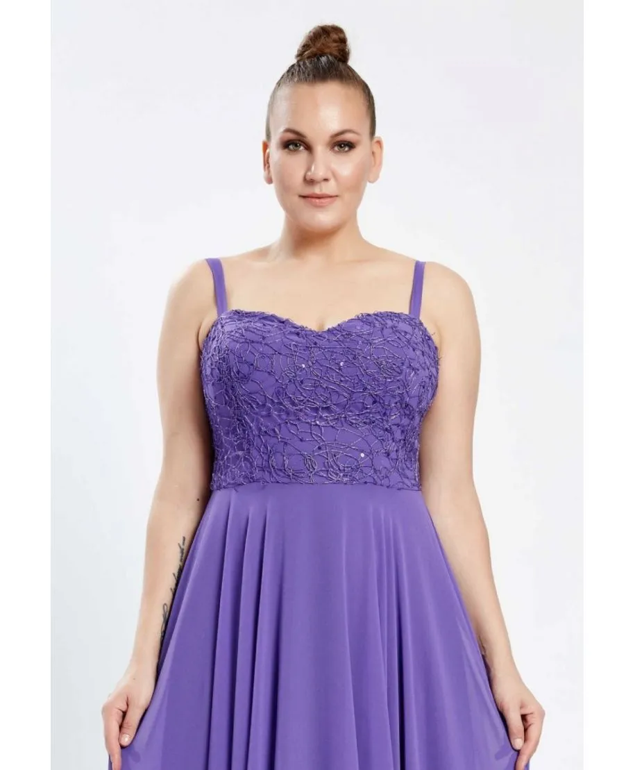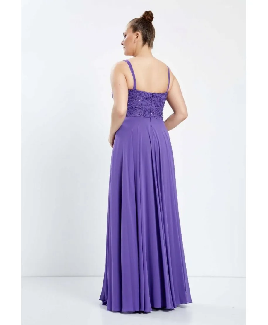 Cerchi un vestito da cerimonia taglie forti? Scegli la semplicità. Questo modello di abito glicine è ideale se desideri un taglio super semplice arricchito solamente dal corpetto ricamato, che accompagna e valorizza anche un seno abbondante. Vestito perfetto con accessori argento o in tinta.