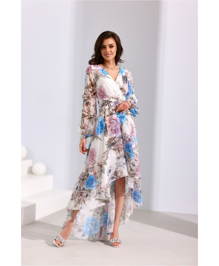 Abito asimmetrico lungo fino al pavimento. Gonna svasata, top con scollo incrociato e incredibili maniche lunghe e svasate con tagli decorativi. Maniche elasticizzate. Abito stretto in vita, metterà in risalto alla perfezione la zona della vita. Chiusura lampo sul retro con una delicata esposizione della schiena. L'abito ha un sottoveste cucito, in modo che il materiale non trasparenti. Basta un po' di gioielli delicati e stupirai tutti intorno a te. Il taglio e la lunghezza saranno perfetti per ogni figura, conferendo leggerezza alla silhouette e aggiungendo visivamente qualche centimetro di altezza. Il materiale leggero e delicato si muoverà leggermente con ogni tuo movimento, lasciando un'impressione indelebile. Prodotto realizzato e cucito in Polonia.