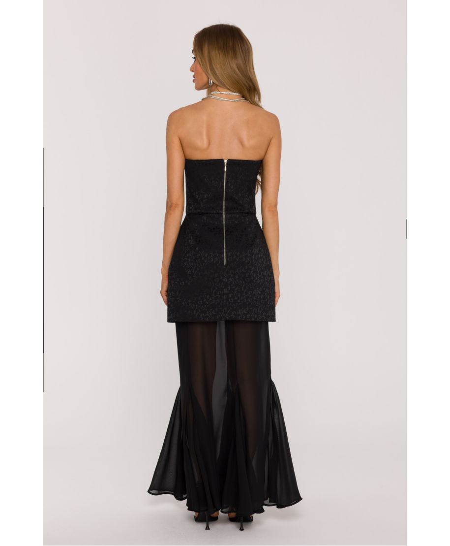 Un elegante e incredibilmente femminile abito che combina la struttura e la leggerezza di due nobili tessuti. Il corpetto è realizzato in tessuto jacquard con un delicato motivo in rilievo che conferisce un carattere unico all'intero abito. Lo scollo a cuore mette in risalto delicatamente la linea delle spalle e del collo, mentre la vita aderente accentua la silhouette. La lunga gonna leggera in chiffon si adagia dolcemente su ogni movimento. Grazie all'elastico in vita, garantisce comodità e una vestibilità delicata. L'abito appare leggero e romantico. Senza tasche né fodera, sottolinea la sua leggerezza e fluidità. Il corpetto si chiude con una cerniera nascosta sul retro, mentre la gonna ha una cintura elastica per un maggiore comfort. Il modello è stato progettato e realizzato in Polonia con cura per ogni dettaglio. Il taglio universale consente di indossare l'abito in modi diversi.
