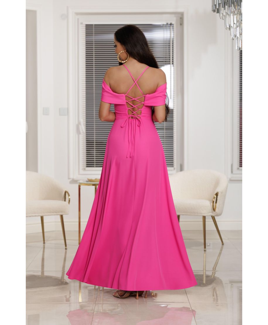 Abito lungo fucsia con scollo alla spagnola e con spacco e bustino drappeggiato – Modello SILLA