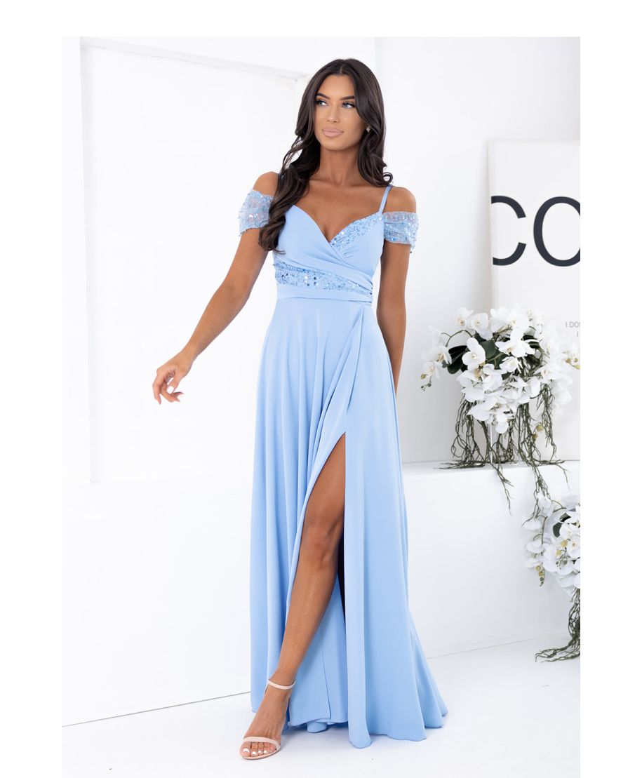 Elegante abito lungo blu, creato per occasioni speciali. Modello dal taglio femminile e aderente, che enfatizza la vita e slancia la silhouette. Il top dell'abito incanta con una scollatura a V a portafoglio, che mette in evidenza delicatamente il seno. Le spalle scoperte sono decorate da maniche delicate e paillettes, che aggiungono luminosità e un tocco serale. I sottili spallacci garantiscono stabilità e comfort. In vita è presente una cintura decorativa con finitura in paillettes, che accentua in modo elegante le proporzioni della silhouette. La gonna lunga e leggermente svasata realizzata in tessuto fluido si adagia perfettamente nei movimenti, mentre lo spacco alto sulla gamba aggiunge sensualità e leggerezza. L'abito si chiude sul retro con una cerniera nascosta, garantendo una perfetta vestibilità e un'ottima finitura estetica. Una proposta ideale per: matrimoni, balli, feste di laurea, eventi speciali, eleganti uscite serali.