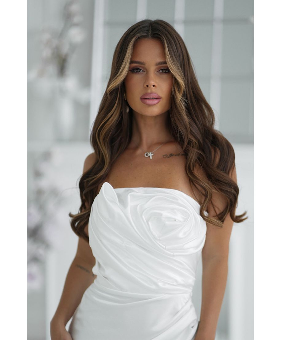 Vestito lungo bianco in raso con rosa couture e spacco – ROSE