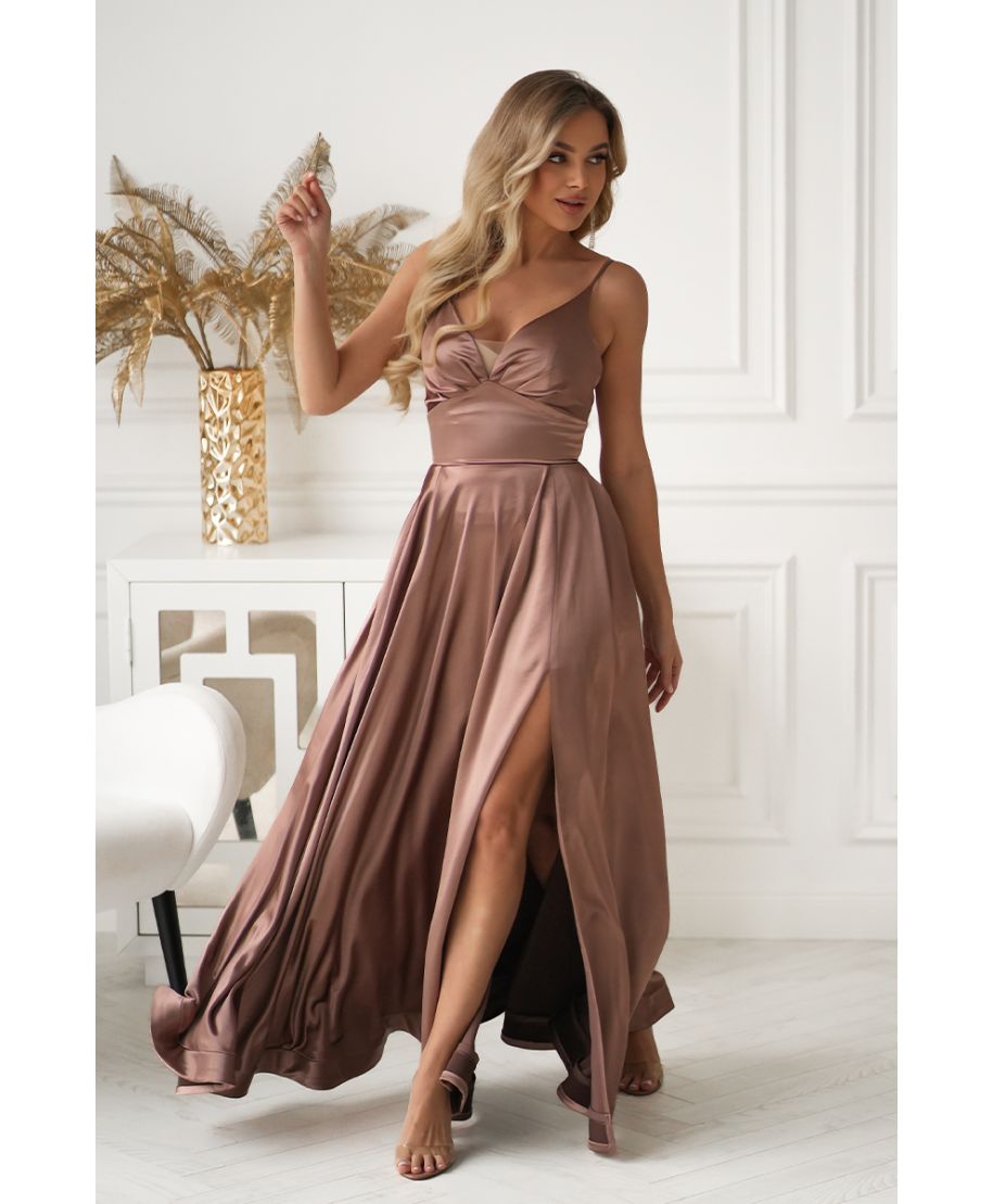 Vestito lungo da sera camel in satin lucente con gonna ampia – Ravenna