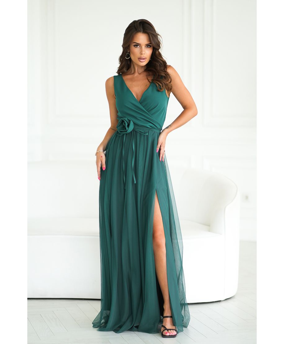Vestito lungo elegante con la gonna in tulle e il corpetto in tessuto liscio. Abito semplice ed elegante. Gonna ha lo spacco sulla coscia e una splendida scollatura che accompagna anche un seno abbondante. Cinturino con rossa da legare in vita o usare come decorazione sul collo.