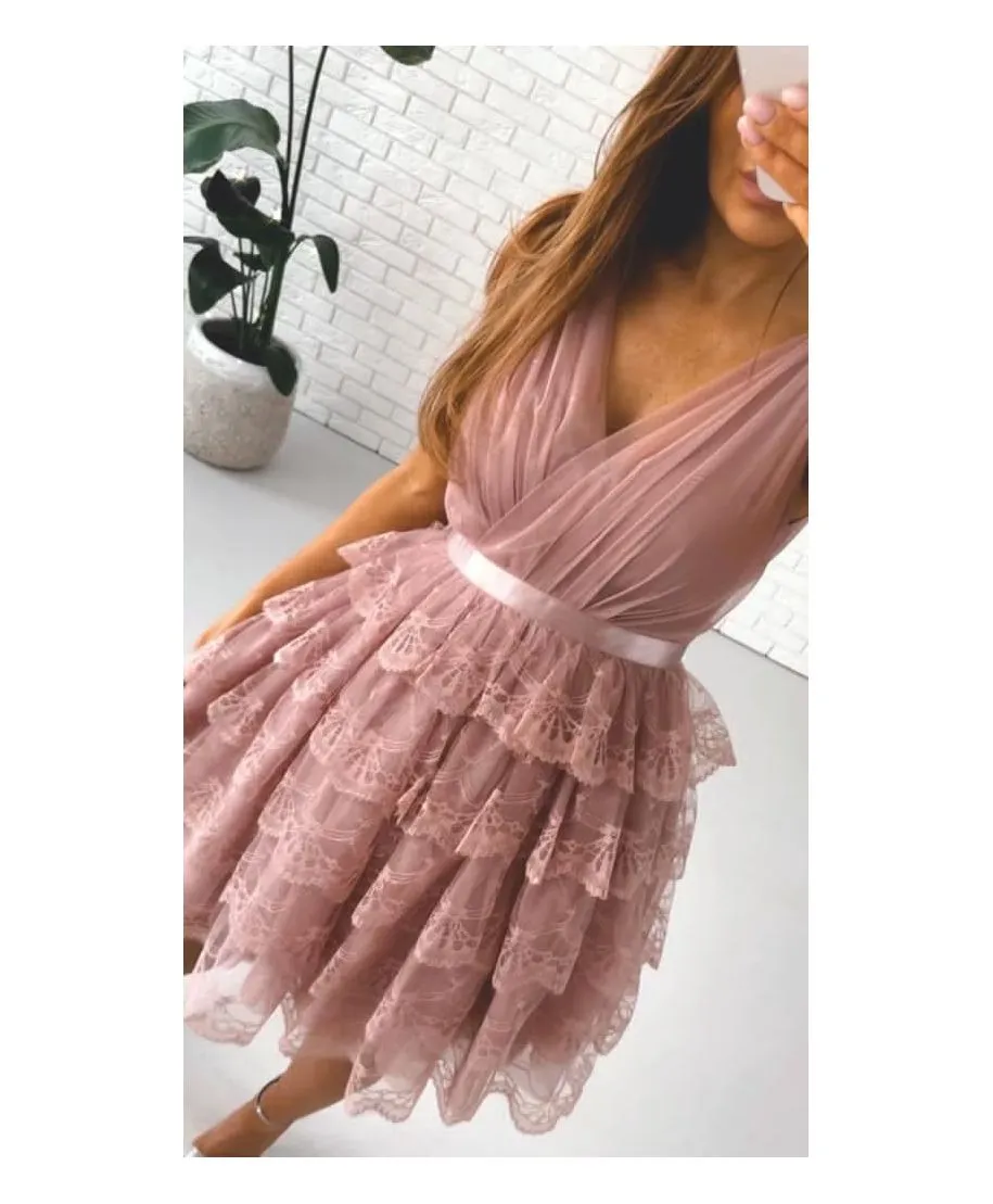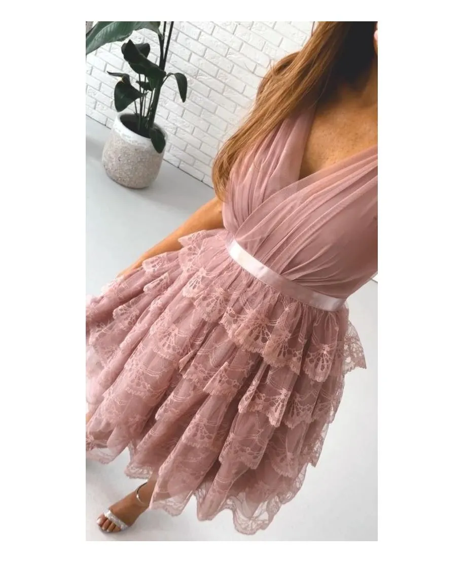 In nostro è un vestito in tulle rosa molto sfizioso poichè e un mix perfetto di eleganza bon ton e sensualità. La gonna corta in tulle e pizzo metterà in mostra le tue gambe. Ma anche se è un vestito corto la gonna a palloncino sdrammatizza il tutto.
