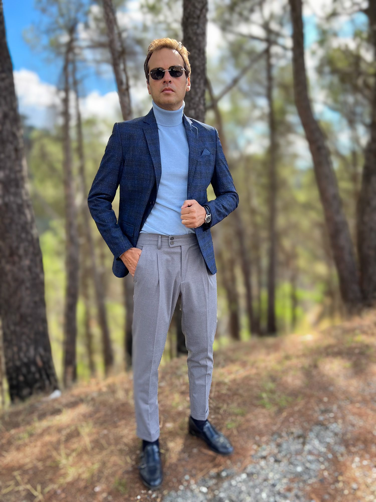Completo con giacca fantasia, a quadri. Collo alto e giacca sportiva.
