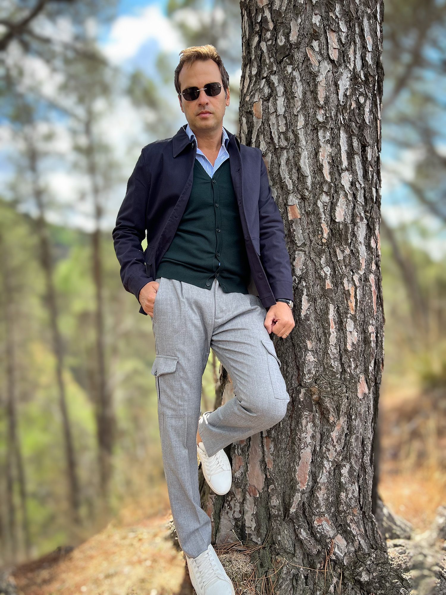 Completo mezzo tempo uomo con cardigan e trench utile per vestire a strati ed esssere pronti all'autunno inverno e i cambi repentini di temperatura.