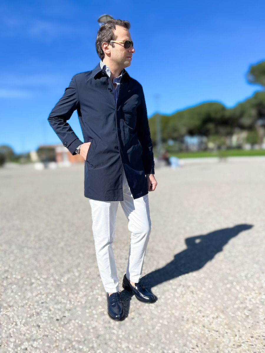 Trench blu su camicia a righe e pantaloni bianchi, completato da mocassini eleganti. Un look primaverile curato e versatile, perfetto per la città, giornate ventose e appuntamenti dove serve uno stile sobrio ma distintivo